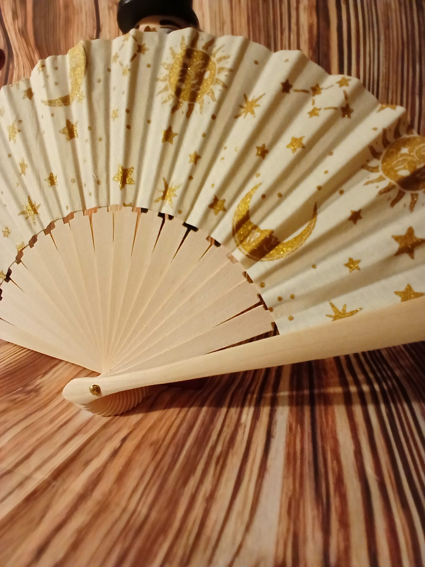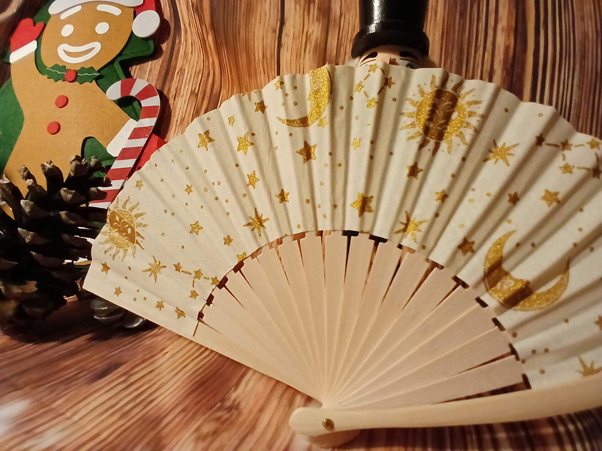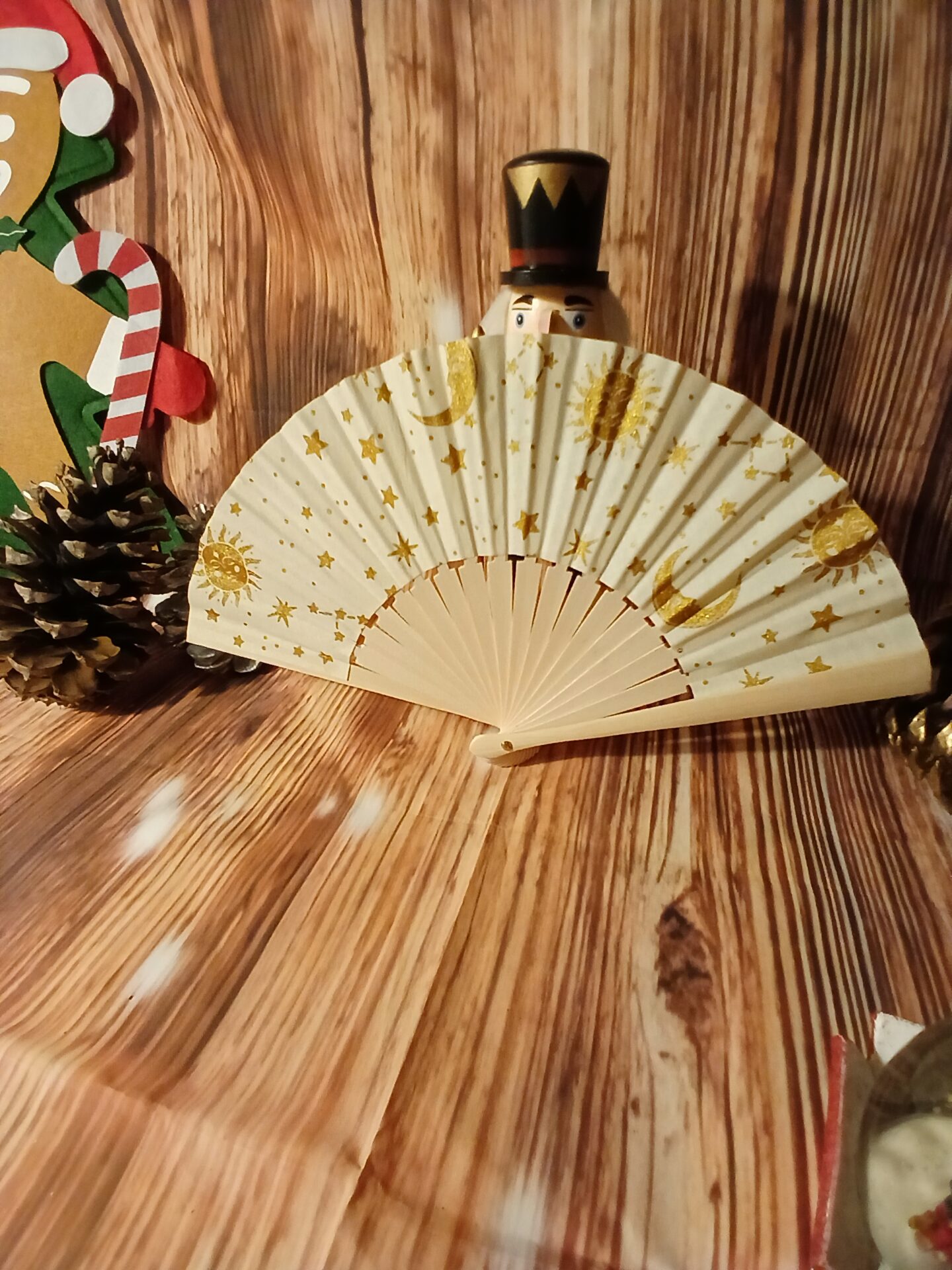Inspiré par la déesse-étoile de la mythologie, l’éventail Astrée capture la magie des longues nuits d’hiver. Son motif céleste doré sur tissu blanc est un véritable coup d’éclat.