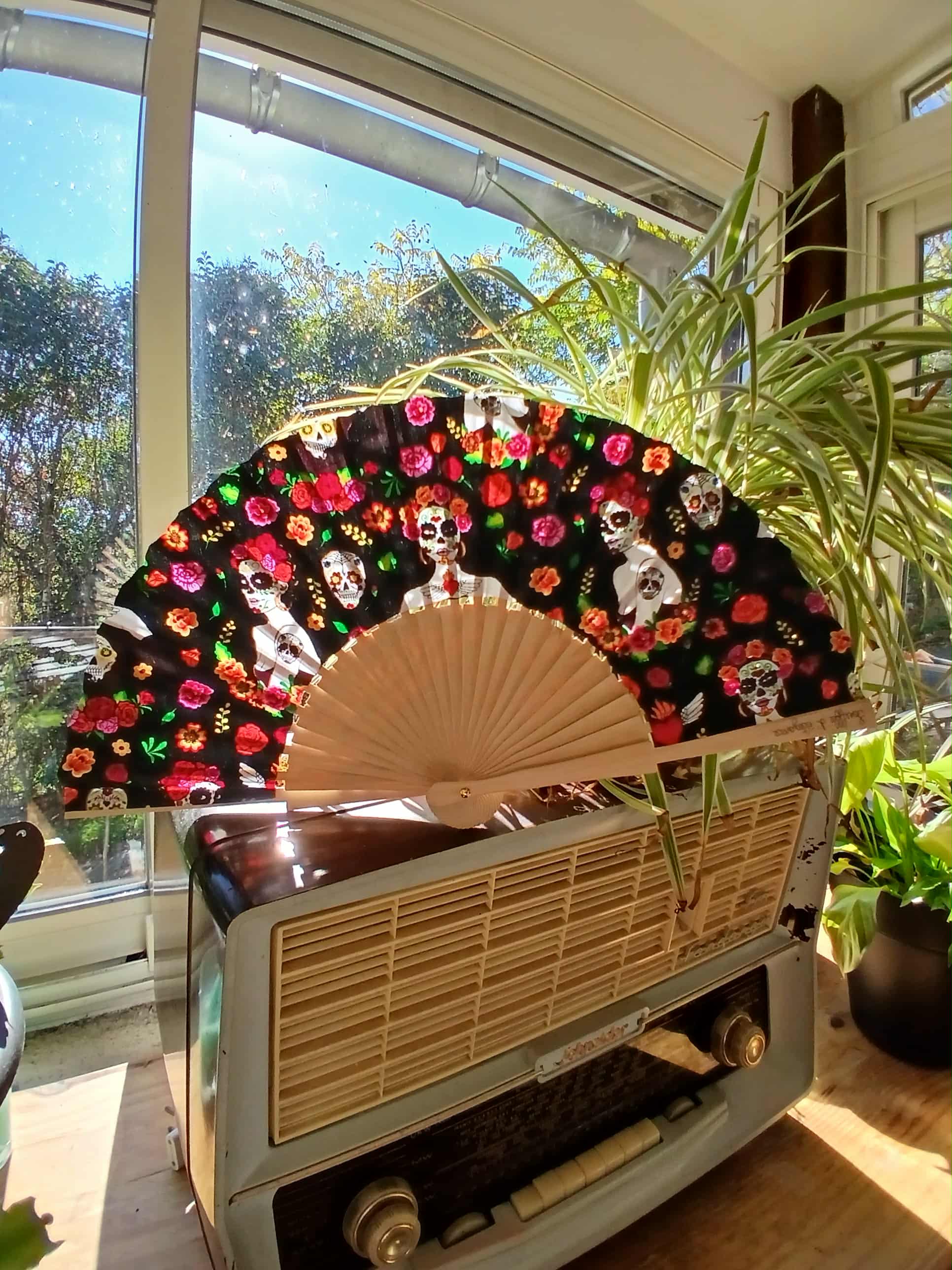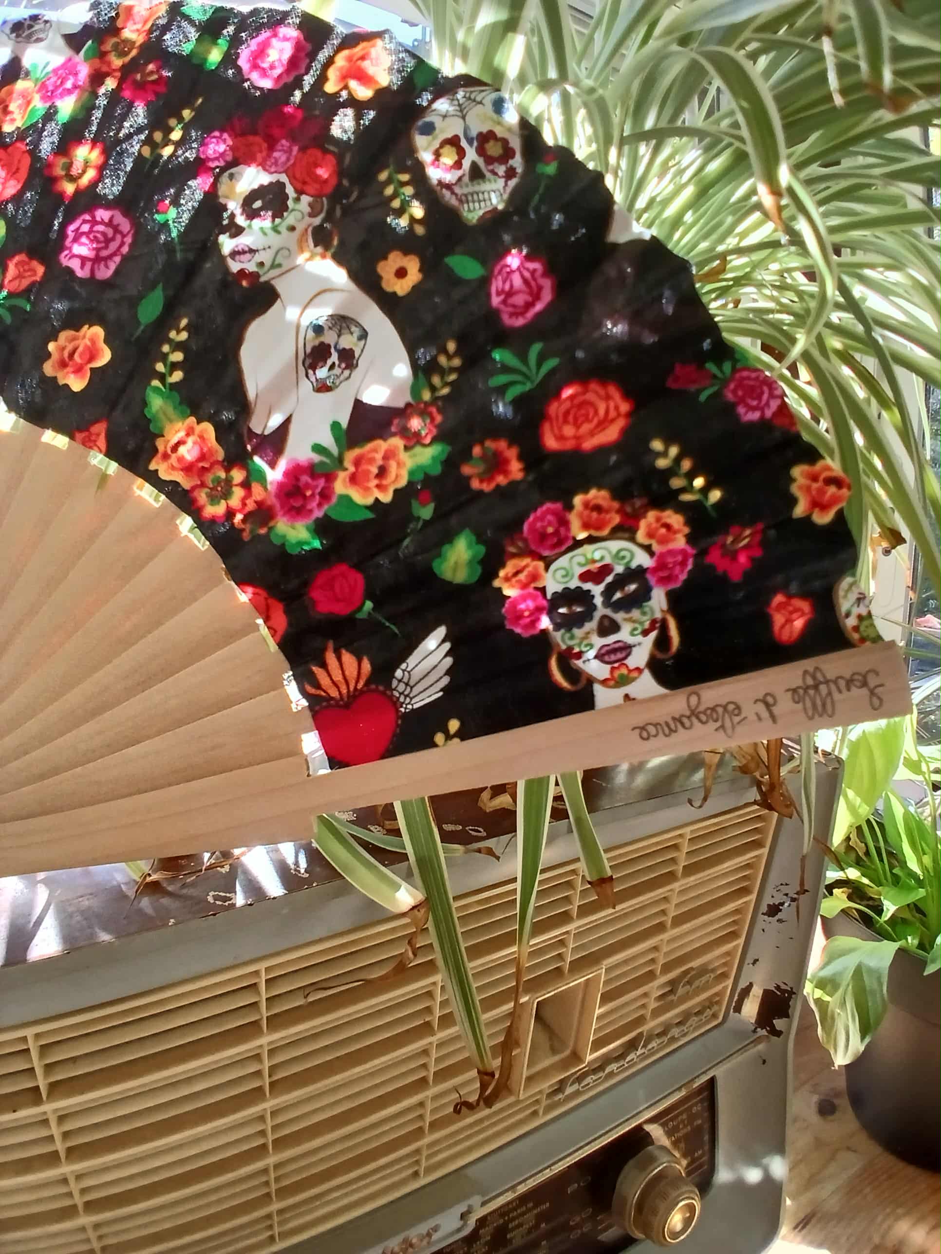 Un souffle d’art et de mystère. L’éventail Catrina mêle la poésie mexicaine du Día de los Muertos à l’élégance artisanale française.