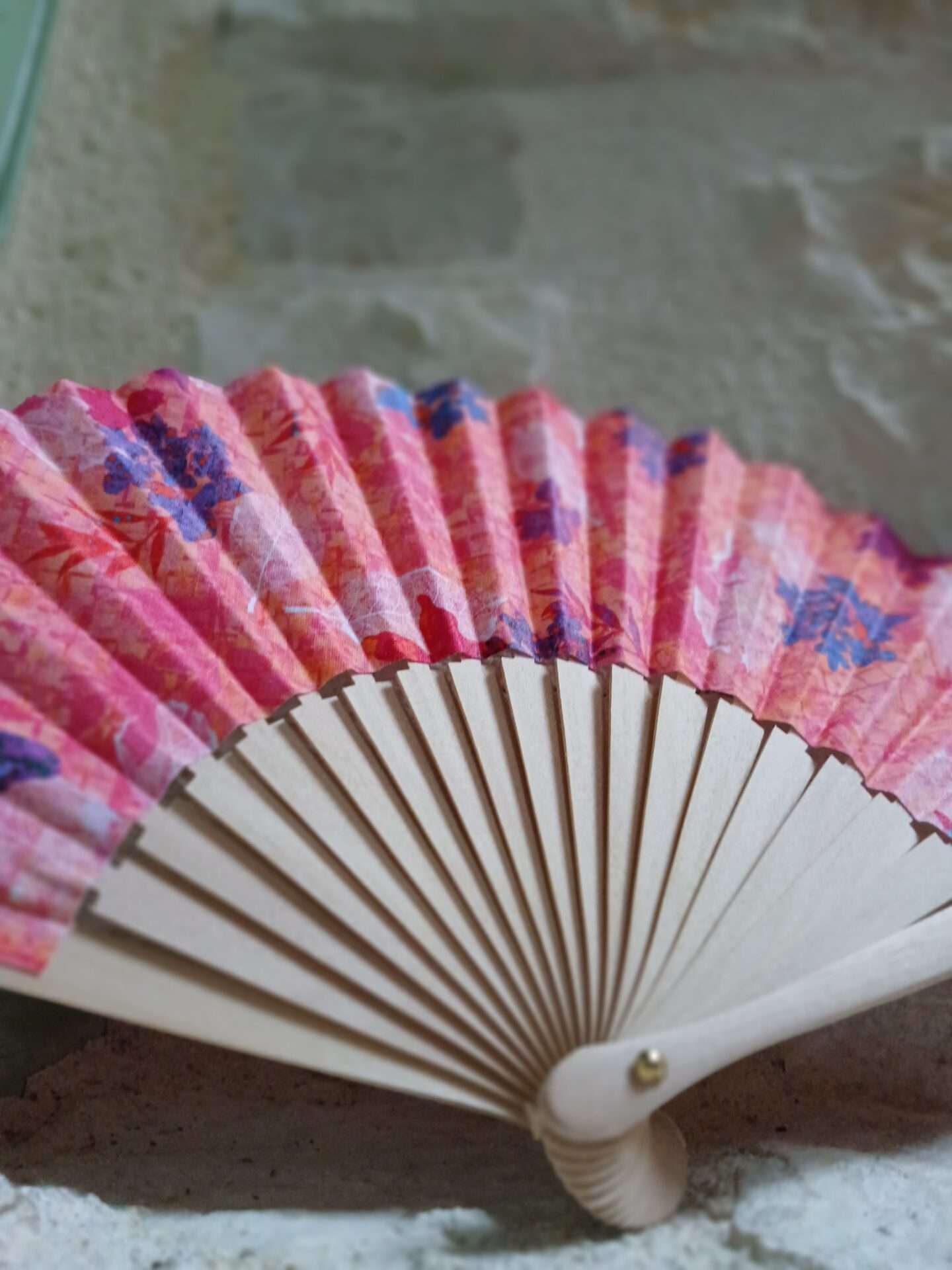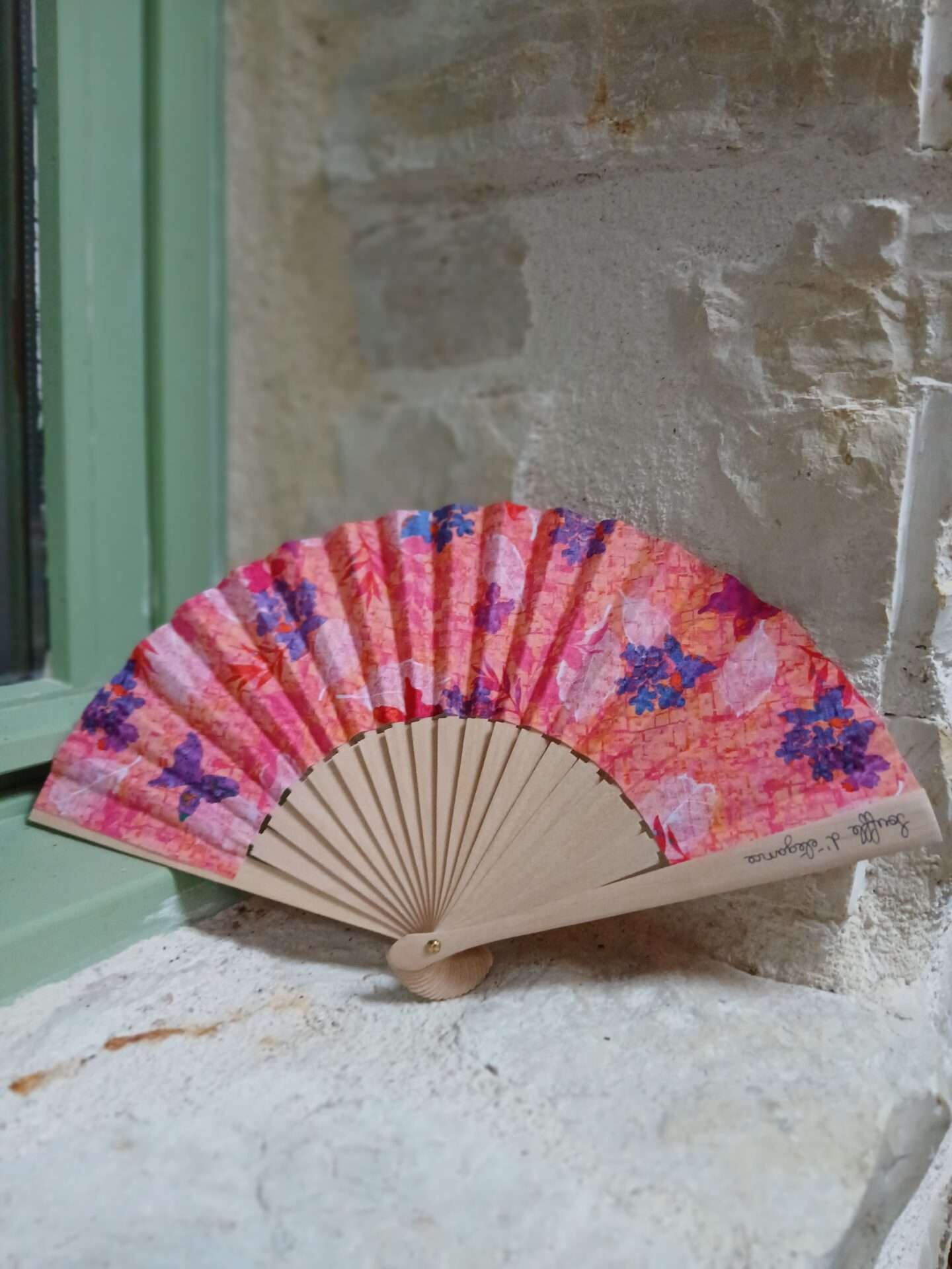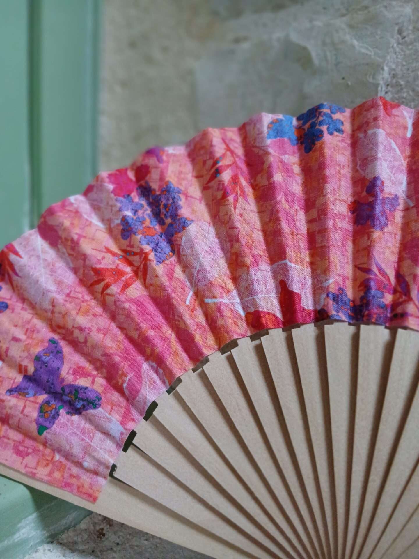 Chaque détail de l’éventail Clara transmet un message fort. En effet, son tissu éclatant, dominé par des nuances de rose et de violet, met en valeur de délicats papillons. Ces symboles universels de métamorphose et de renouveau rappellent que chaque femme peut se réinventer et déployer ses ailes. De plus, les branches en bois naturel apportent authenticité et douceur. Ainsi, Clara devient un compagnon raffiné que l’on emporte facilement dans un sac et que l’on expose fièrement en décoration.