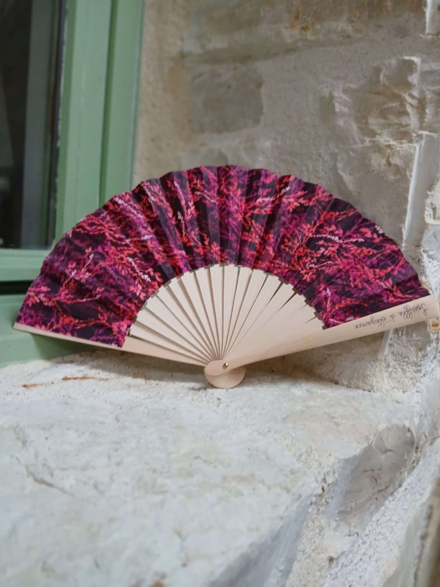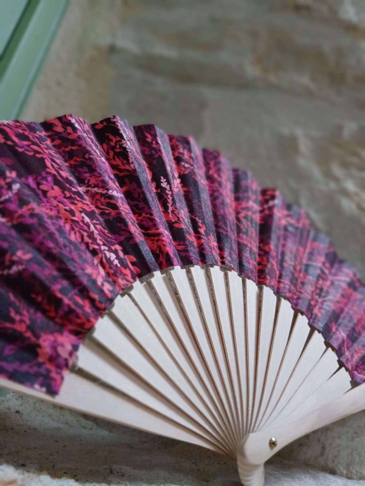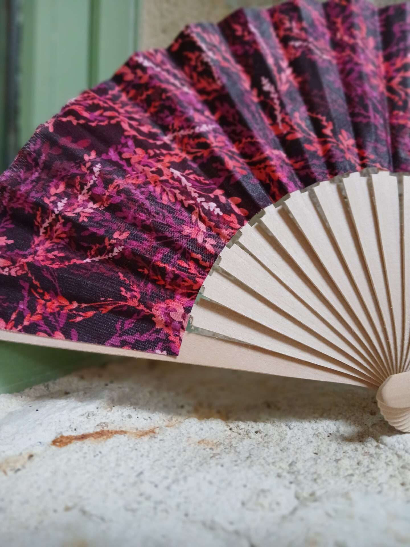 Chaque détail de l’éventail Frida reflète son esprit libre et flamboyant. Son tissu intense, dominé par des nuances de rouge, de violet et de noir, évoque à la fois la passion, la force et l’audace. Les motifs végétaux rappellent la nature qui inspirait l’artiste. De plus, les branches en bois naturel apportent authenticité et équilibre. Ainsi, Frida devient un compagnon pratique, facile à glisser dans un sac et aussi magnifique en décoration.