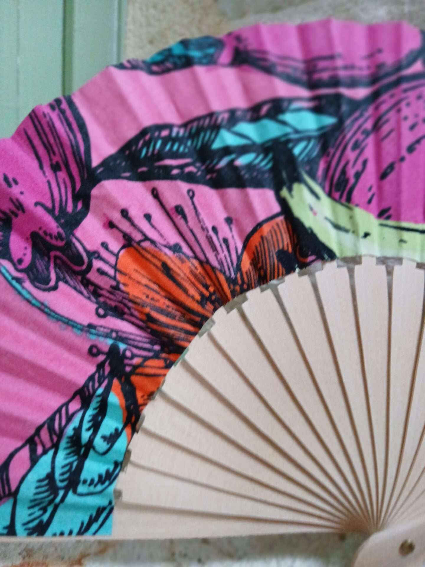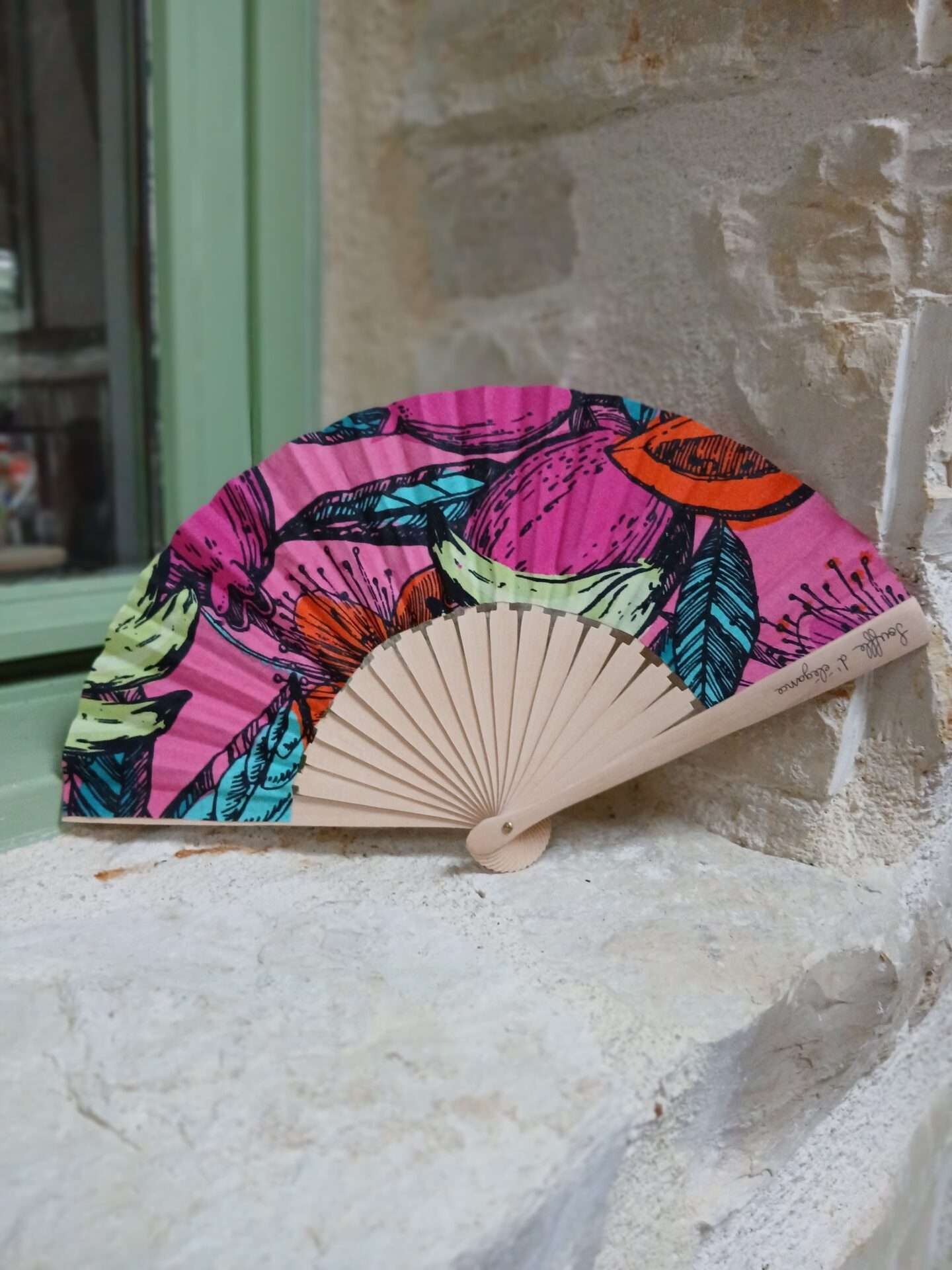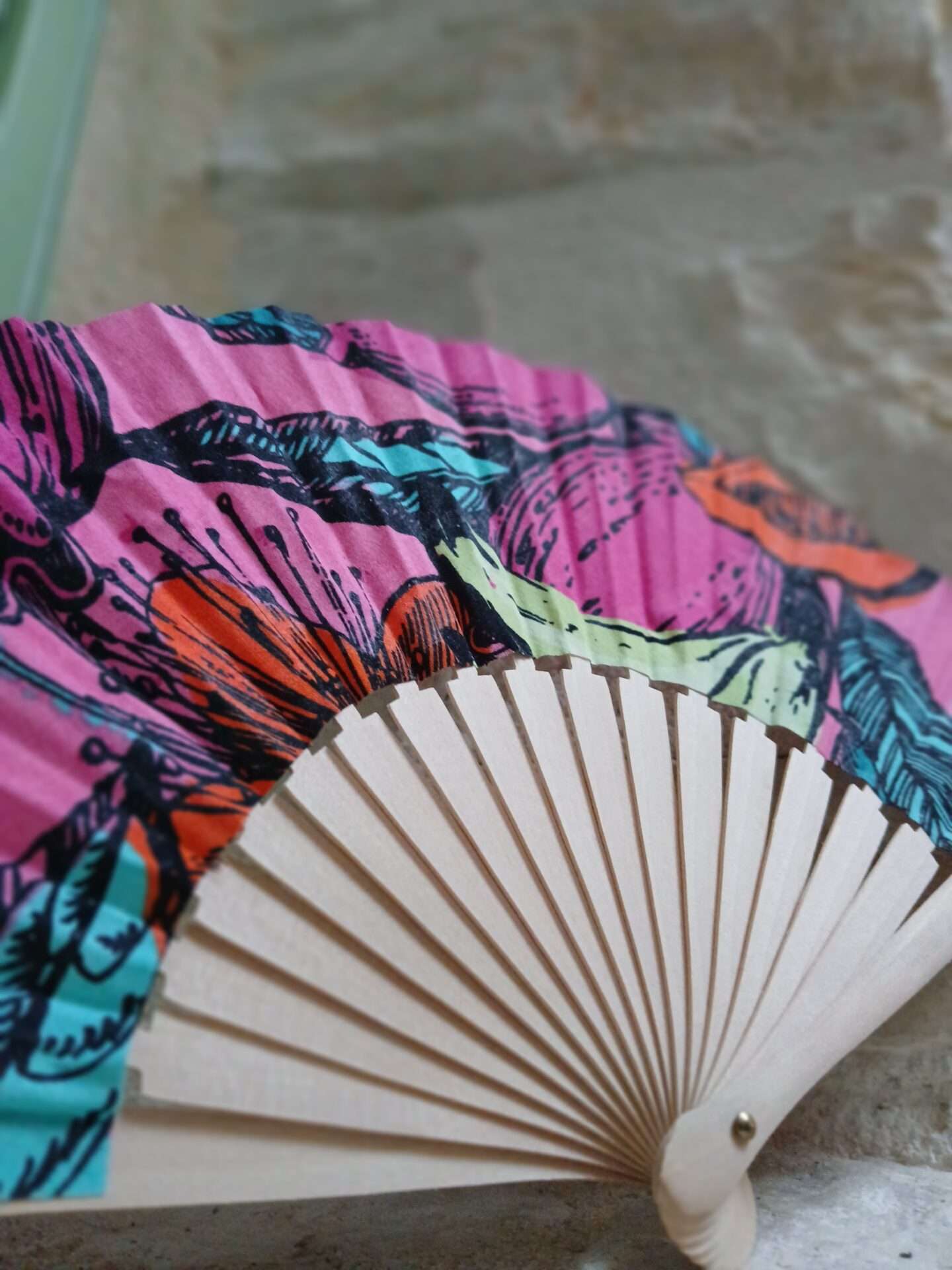 Chaque détail de l’éventail Maya attire le regard. Son tissu rose vif se pare de grands motifs floraux multicolores aux tons orange, vert et turquoise. Ce contraste puissant évoque la diversité, l’audace et l’harmonie. De plus, les branches en bois naturel équilibrent l’ensemble et apportent une touche de douceur. Ainsi, Maya devient un compagnon pratique et artistique, facile à emporter ou à exposer comme objet décoratif.