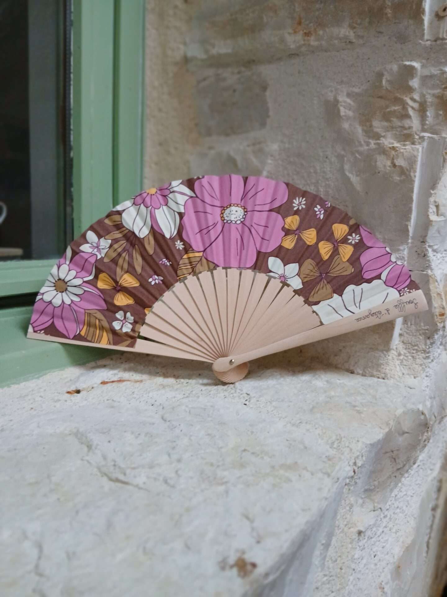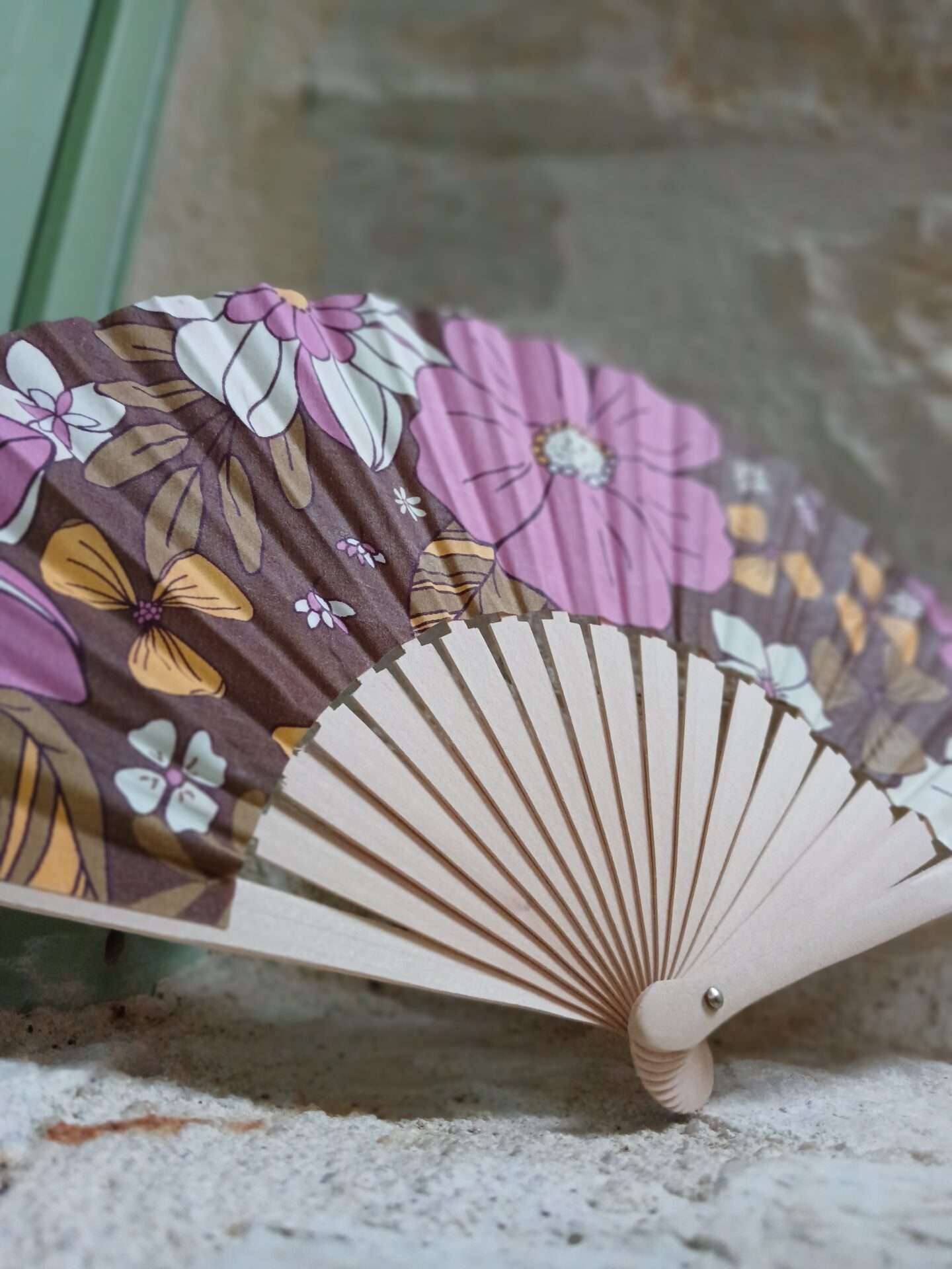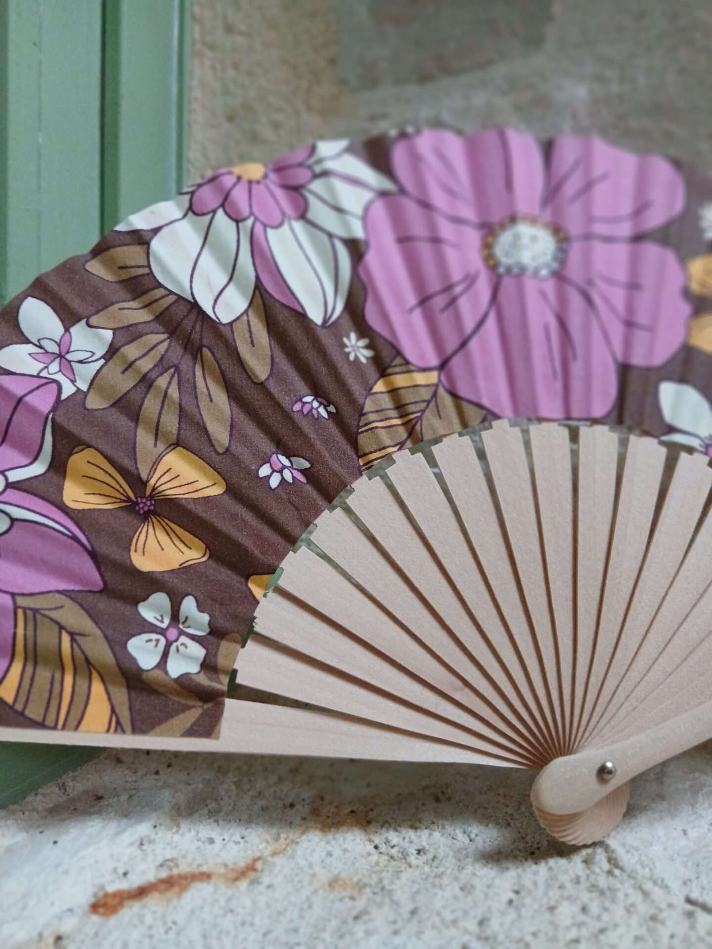 Chaque détail de l’éventail Olympe exprime un style affirmé. Son tissu à fond marron profond met en valeur de grandes fleurs colorées en rose, jaune et blanc. Ce contraste puissant rappelle l’harmonie entre la douceur et la puissance. Les branches en bois naturel équilibrent ce design éclatant et apportent authenticité et chaleur. Ainsi, Olympe devient un compagnon raffiné, pratique à emporter et agréable à exposer en décoration.