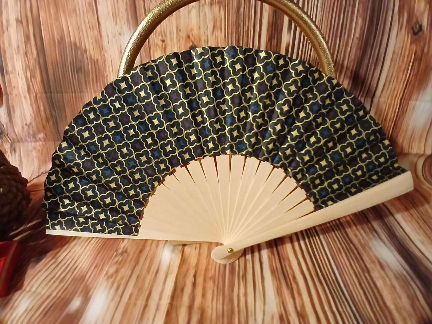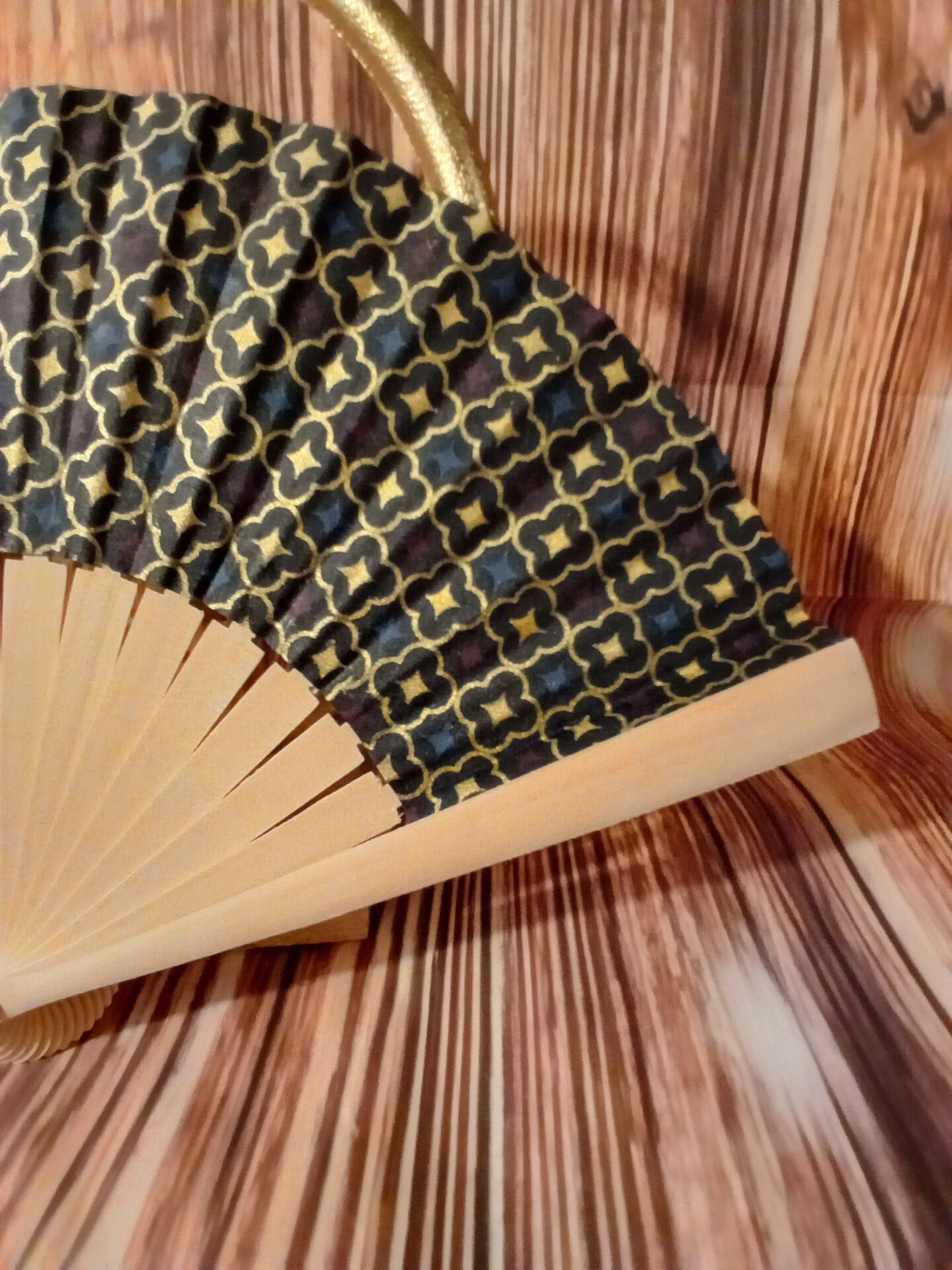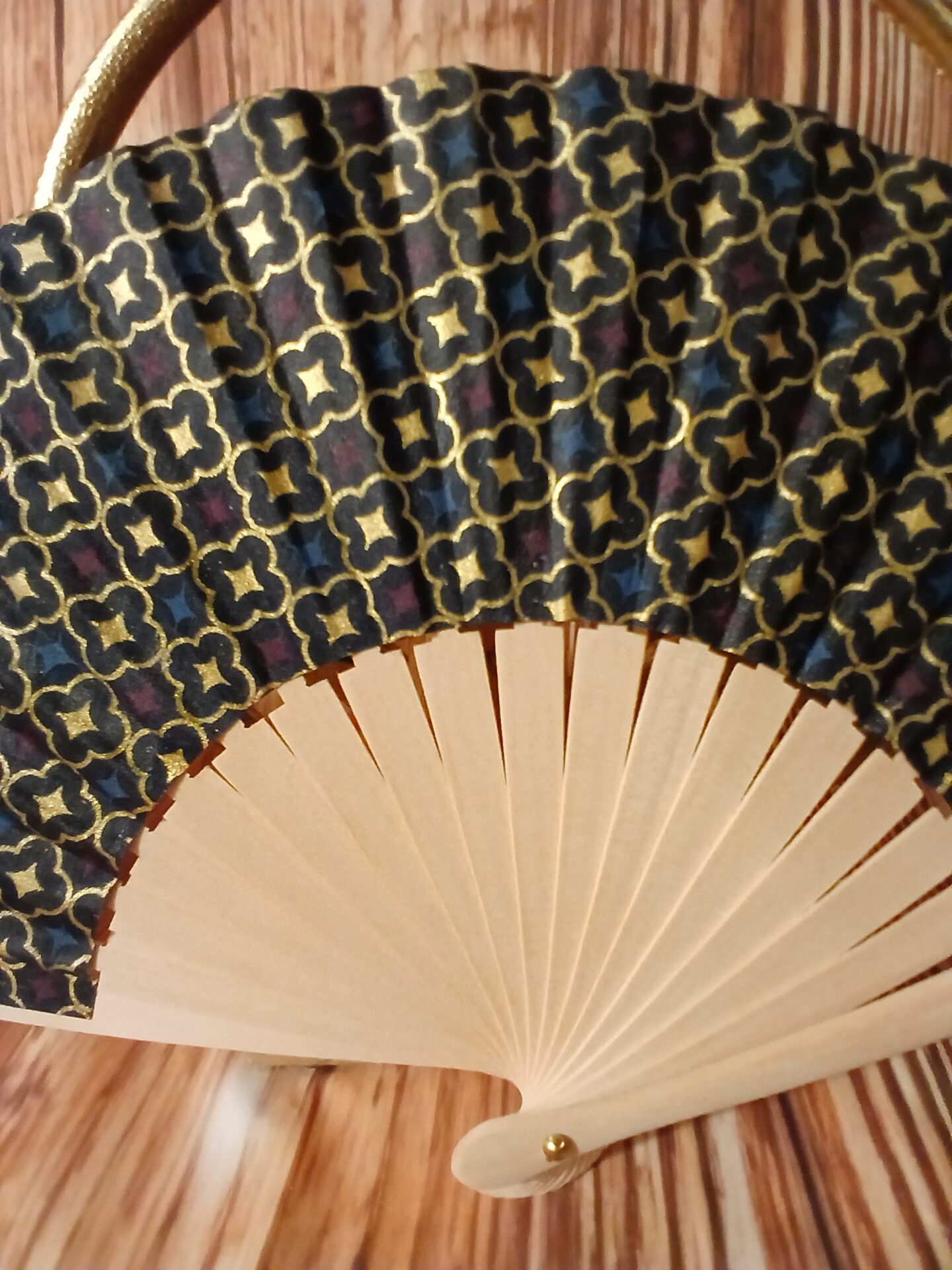 Ce design unique est l’incarnation de la richesse. L’éventail motif or et bleu arbore un fond très sombre. Il mêle le bleu saphir au violet/prune pour créer une profondeur veloutée. En effet, le motif doré sur ce fond sombre prend un éclat incomparable. De plus, chaque élément du motif est reproduit avec une précision qui honore le savoir-faire artisanal. Cet éventail pliant de luxe est une pièce forte. Par conséquent, il est parfait pour celles qui désirent un accessoire à fort impact visuel. La qualité des matériaux est une garantie Souffle d’Élégance.